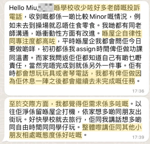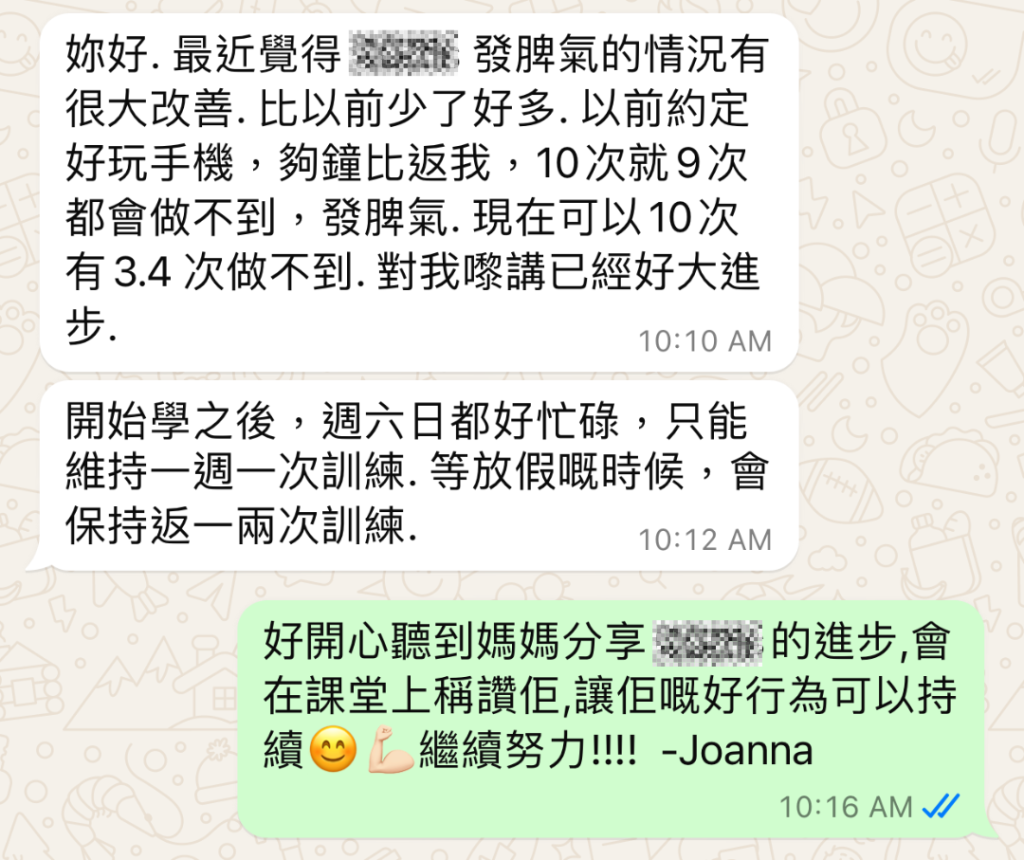 媽媽表示小居變得自律,無論發脾氣的次數及強度都有改善。學業方面,功課比以前整齊,老師也表示小居的多動行為有很大改善,能夠在適當場合作出適當的行為
