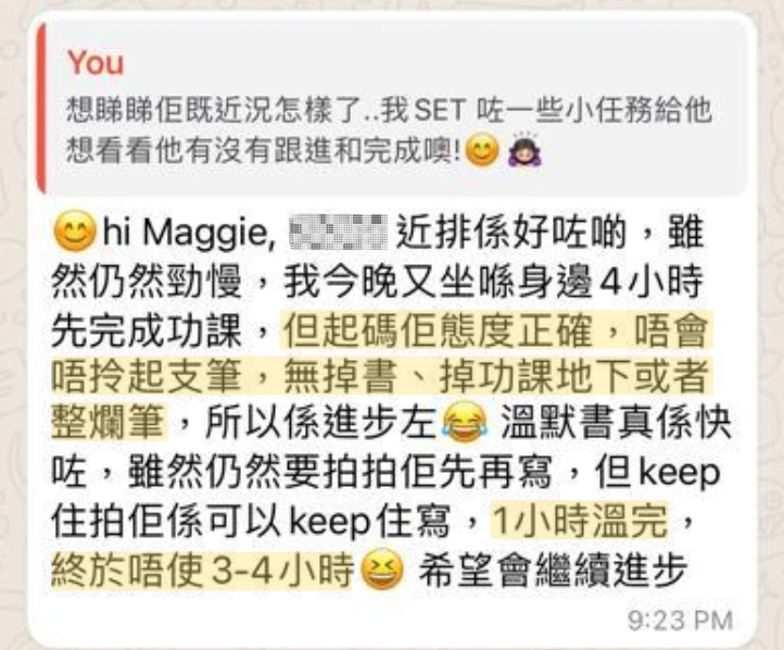 隨著培訓成績的提高,小卡變得自信並對學習任務定下期望,向導師表示希望自己”做功課快D,考試叻D”,媽媽表示現在小卡會坐定定完成功課或溫習才會走開,更會主動提出幫忙做家務