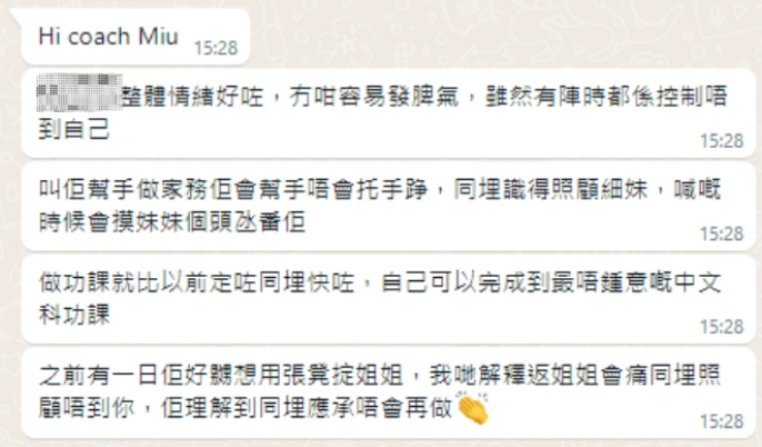 透過自我成長課程,小依明白無論學校的功課以及培訓活動都不再是別人強逼的任務。小依也向媽媽表示希望嘗試自主多一些,溫習由以往3、4個小時變成1個小時。