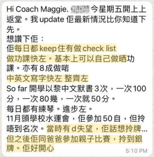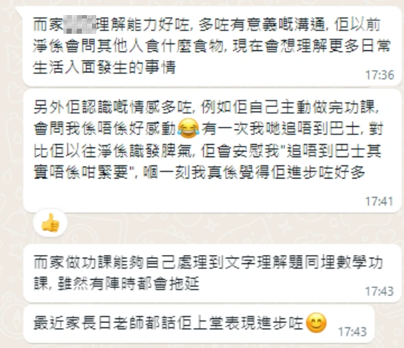 媽媽表示小嘉能控制自己的多動需要, 專注時間延長, 在課堂和家中都專心完成自己的任務, 提升學業成績。